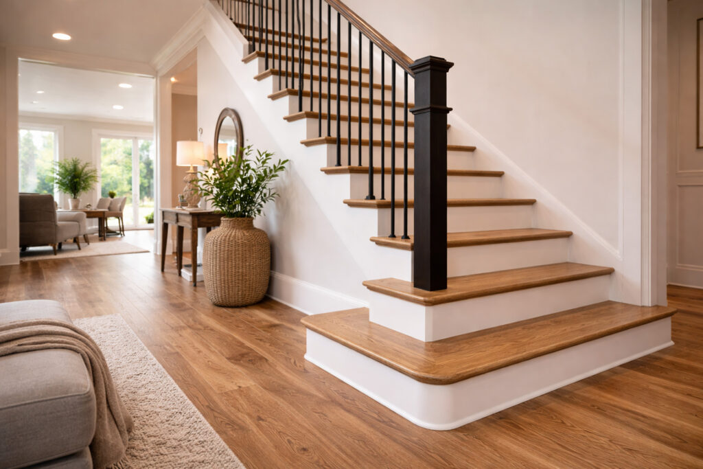 Includes: treads, risers, repairs, refinishing, and clean trim details.